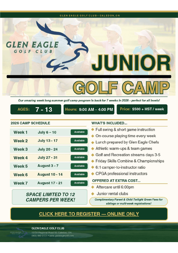 Glen Eagle’s Junior Camps are the highlight of summer for our local blossoming golfers. Designed for ages 7 to 13, each week-long session combines professional PGA instruction with fun games, on-course play, and the kind of confidence-building experiences that keep kids coming back year after year.